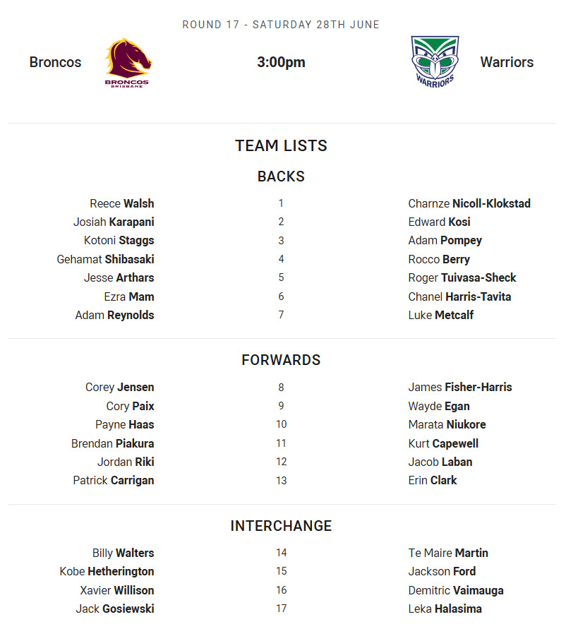 Broncos vs Warriors – Saturday 3:00PM (AEDT) at Suncorp Stadium