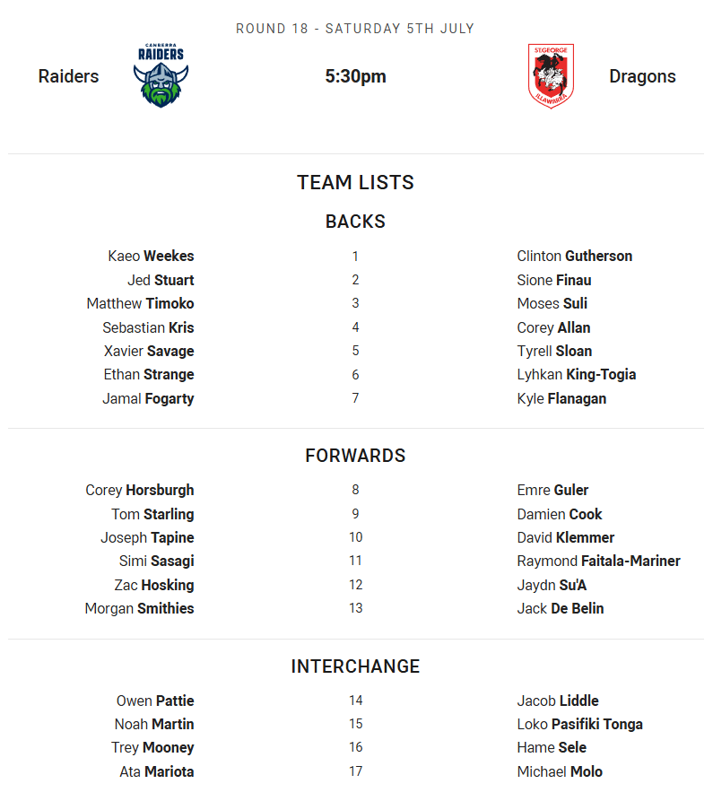 Raiders vs Dragons – Saturday 5:30PM (AEDT) at GIO Stadium