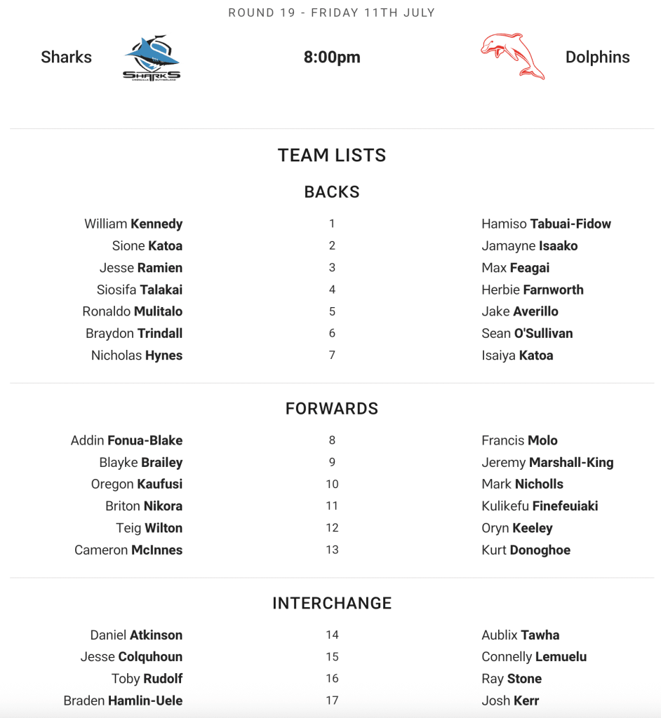 The ever so predictable Sharks put up the close to the same squad as the side who went down to the Storm, with the only change being Dan Atkinson in for Billy Burns.