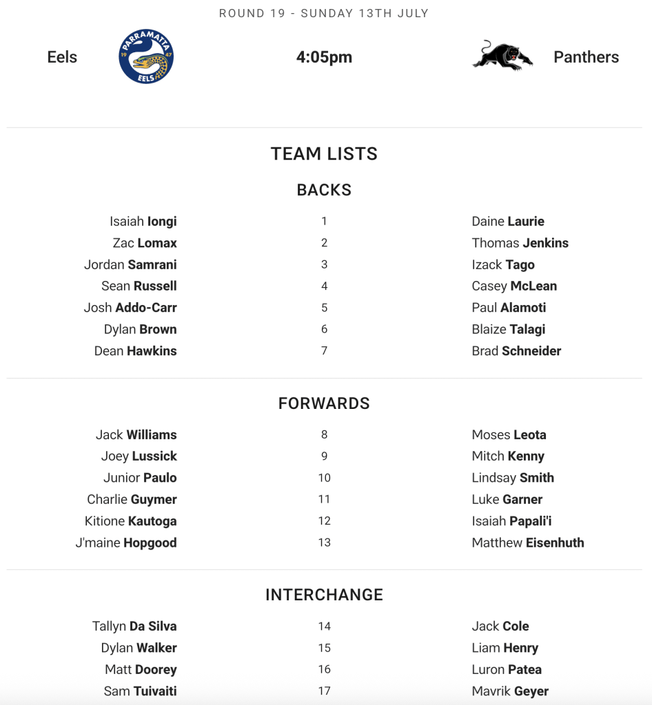 Plenty of eyes will be on final team lists with Origin stars Dylan Edwards, Nathan Cleary, Isaah Yeo, Liam Martin, and Brian To’o listed among the reserves. This sees Daine Laurie, Brad Schneider, Matt Eisenhuth, Isaiah Papali’i, and Paul Alamoti take a spot in their respective positions.