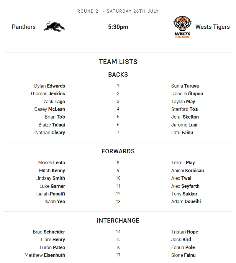 The Panthers welcome back Nathan Cleary and Isaah Yeo. Brad Schneider moves to the interchange, and Isaiah Papali’i moves to the back row to replace Scott Sorensen with Liam Martin lurking in the reserves (wrist injury). Izack Tago returns from suspension which sees Paul Alamoti move to 18th man.
