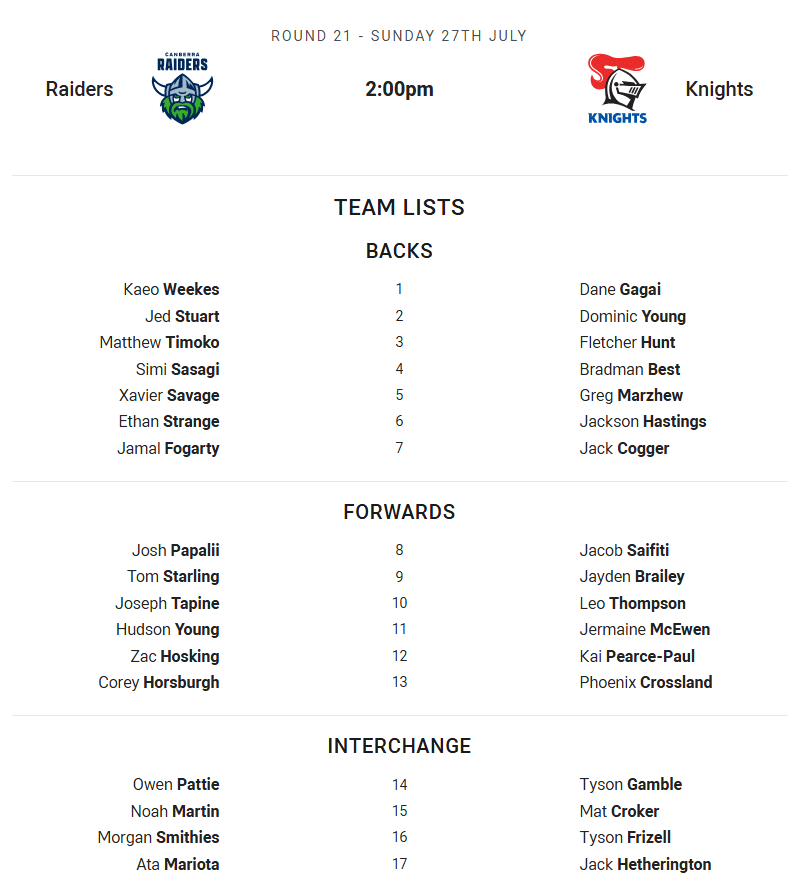 Just the one change too for the Knights with Jack Hetherington recalled to the interchange.