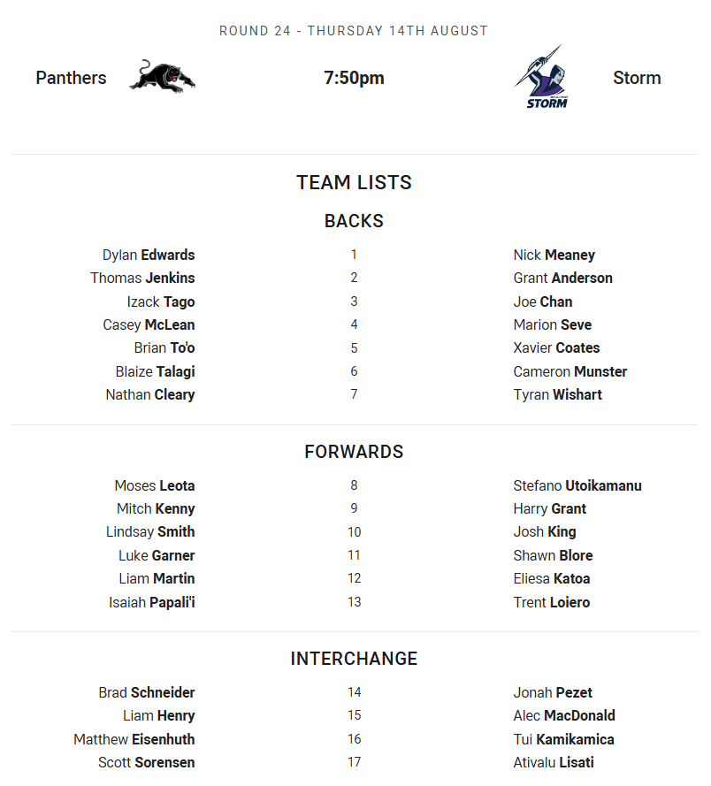 Moses Suli is out with a knee injury, which sees Mat Feagai come into the side as he recovers from a groin niggle. Michael Molo returns from injury and takes a spot on the bench along with Loko Pasifiki Tonga. Christian Tuipulotu returned to NSW Cup last week and has been named in the extended squad.