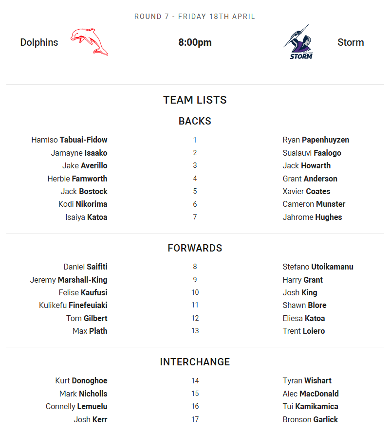 Dolphins vs Storm – Friday 8:00PM (AEDT) at Suncorp Stadium