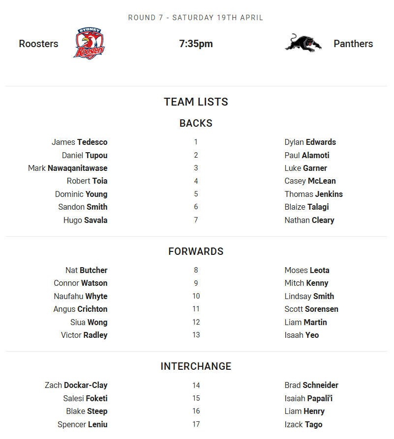 Roosters vs Panthers – Saturday 7:35PM (AEDT) at Allianz Stadium