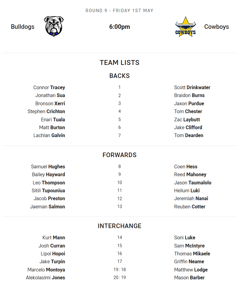 Jake Averillo is out with a hand injury, which sees Trai Fuller named at centre (after playing there last week despite being named at #6) Brad Schneider starts at 5/8. Morgan Knowles starts at lock. Keeley, Bostock and Donoghoe have all been named on the bench or reserves, so keep an eye on final teams.