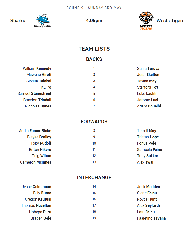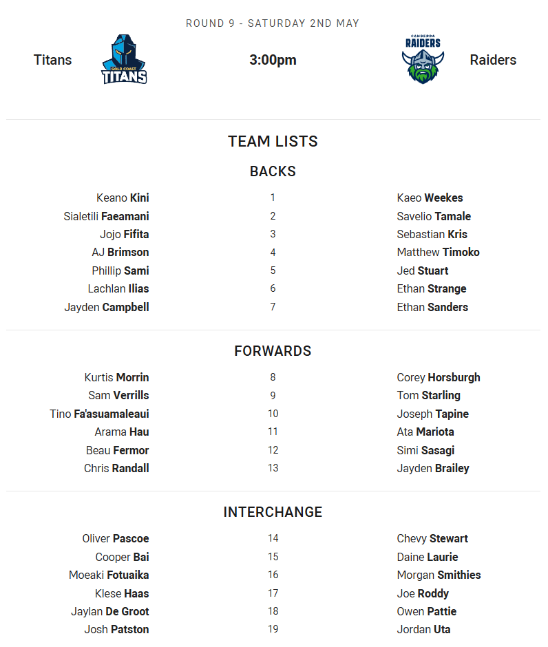 Turuva will start at fullback, after Bula reinjured his shoulder last week. Skelton comes onto the wing. Tristian Hope starts at hooker, with Koroisau missing due to suspension. Pearce-Paul misses this game due to concussion, with Sukkar replacing him in the back row.