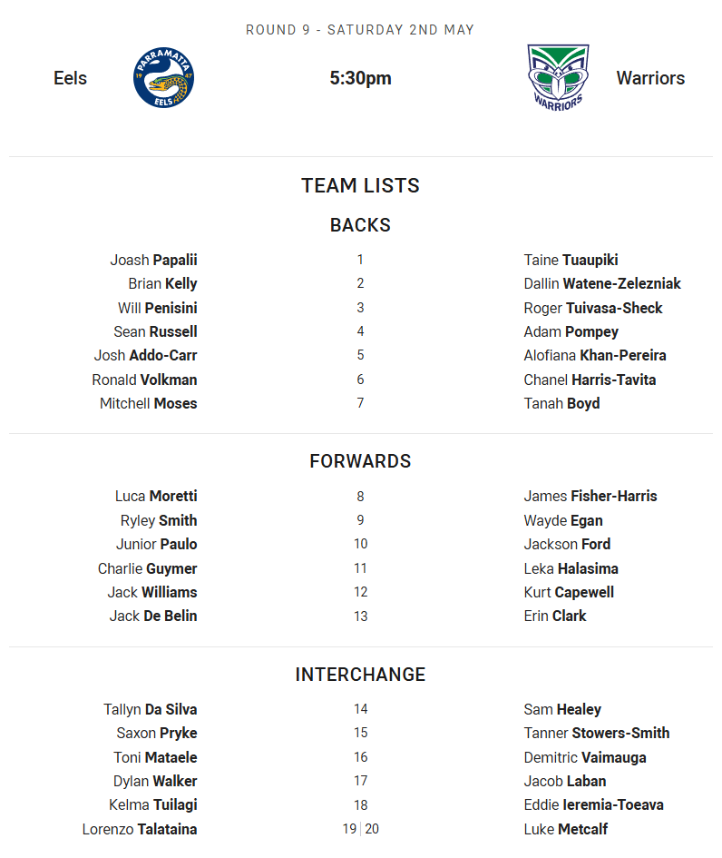 Eels vs Warriors – Saturday 5:30PM at CommBank Stadium